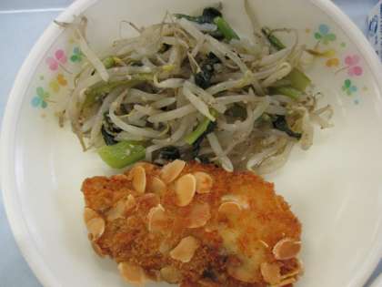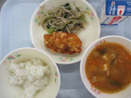 ご飯 牛乳 ホキアーモンドフライ もやしとこまつなの炒め物 キムチスープです。