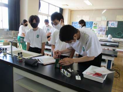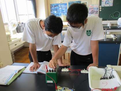 2年生が、理科の授業で、直列回路・並列回路を作って、それぞれ決めた地点の電流の大きさをはかっていました。