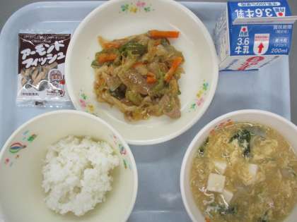 ご飯 牛乳 回鍋肉 中華コーンスープ アーモンド小魚です。