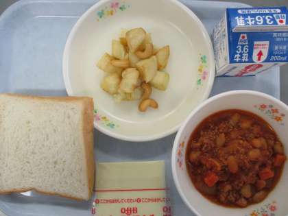 食パン 牛乳 チリコンカン ポテトとナッツのからあげ