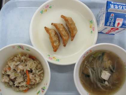 中華炊き込みご飯 牛乳 あげ餃子 はるさめスープ です。