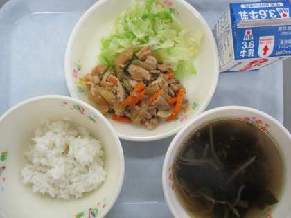 ご飯 牛乳 スタミナ焼き肉 ボイルドキャベツ わかめスープです。