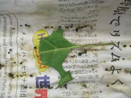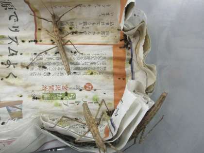 1ぴきが、かごと新聞紙の間で窮屈そうにしています。