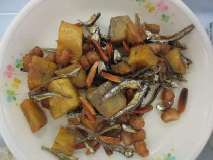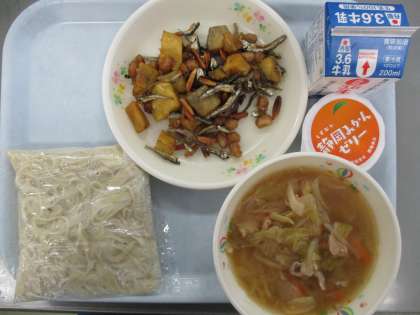 中華麺 牛乳 みそラーメン サツマイモと小魚の揚げ煮 みかんゼリーです。