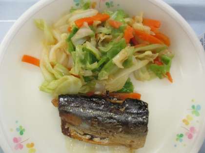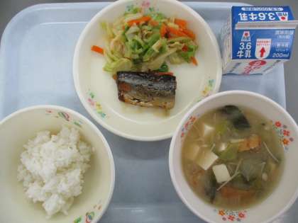 ご飯 牛乳 サンマのかぼすレモン煮 からし和え 豆腐と玉葱の味噌汁です。