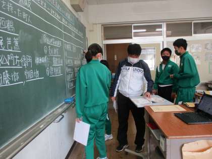 2年生の皆さん、次に示す人物は元禄文化で活躍した人でしょうか、化政文化で活躍した人でしょうか(黒板の内容から出題です)。