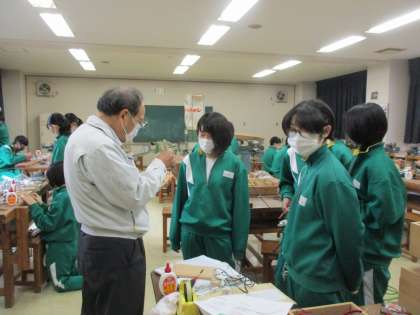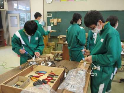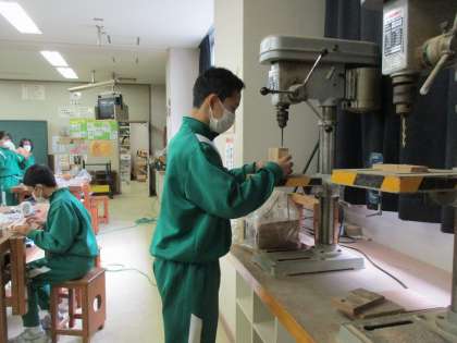 土台になる部分を作っている生徒、土台にコードを通すための穴を開けておる生徒、