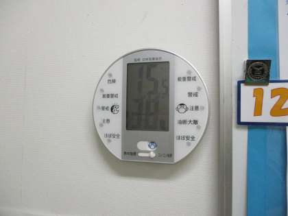 気温15.5度、湿度38%でした(保健室前の室温と湿度です)。