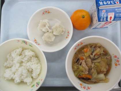 ご飯 牛乳 中華丼 しらすシューマイ みかんです。