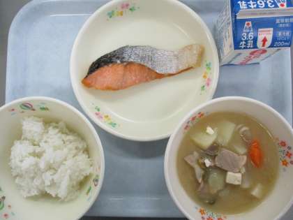 駿河の極みご飯 牛乳 焼き塩鮭 とんじるです。