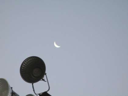 照明の向こうに見える三日月を撮ってみました。太陽に照らされている側が、つまり東側が光っています。