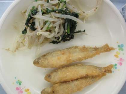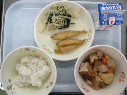 ご飯 牛乳 わかさぎフライ もやしとほうれんそうのナムル じゃがいもと生揚げの煮物です。