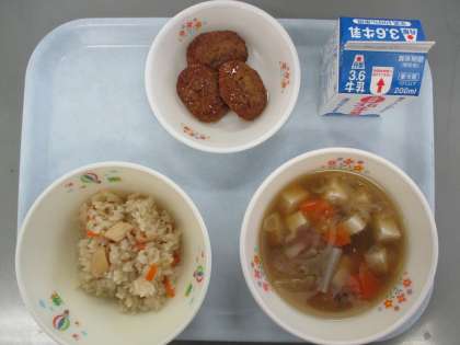 ご飯 牛乳 レバー入りつくね のっぺい汁 です。