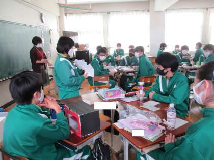 3年生が家庭科の授業で「幼児のためのおもちゃづくり」の学習をしていました。