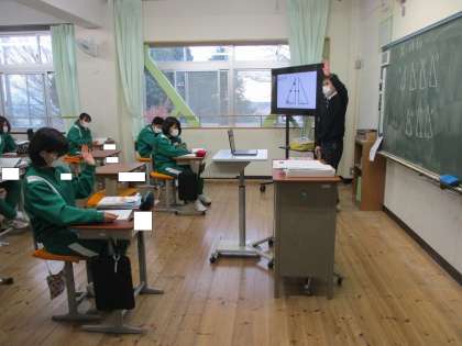 真ん中の写真の一番手前にいる生徒が自分の考えを説明していたので