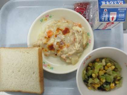 食パン 牛乳 チキンポテトグラタン 海藻サラダ いちごジャムです。