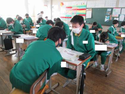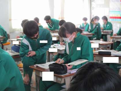 3年生が、英語の授業で、問題を解きながら、本文の読み取りを行っていました。