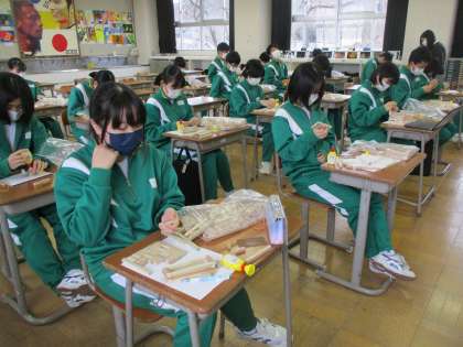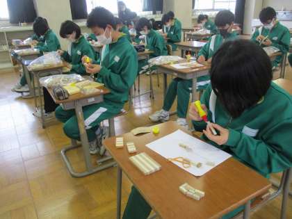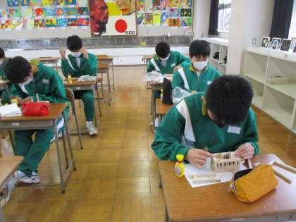 2年生が、美術の授業で「寄せ木をして小物入れを作る」という学習をしていました。