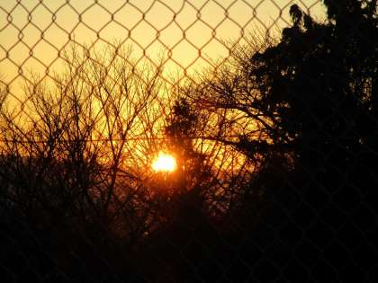今朝の太陽と月の位置関係を、バックネット付近から撮影しました。