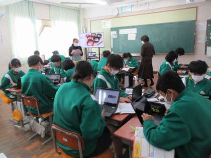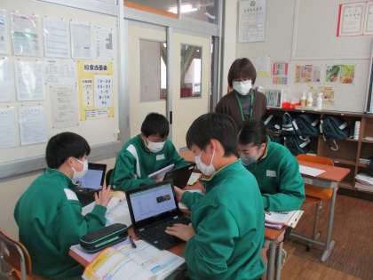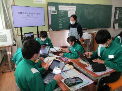 1年生が家庭科の授業で、「地域の食材を生かした調理をしよう」という学習をしていました。特に今日は、ゲストティチャーとしてA小学校の栄養教諭さんをお招きしての授業でした。