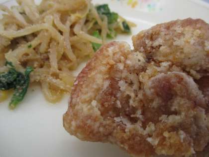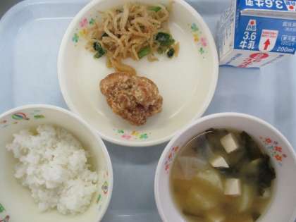 ご飯 牛乳 鶏肉の唐揚げ もやしと小松菜のごま和え じゃがいもと大根の味噌汁です。