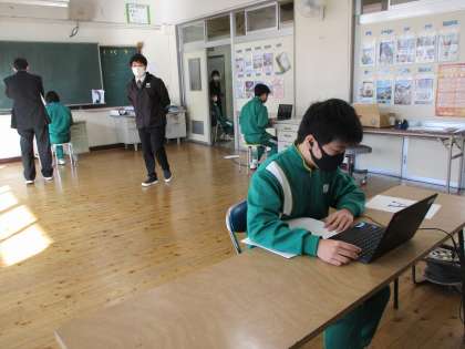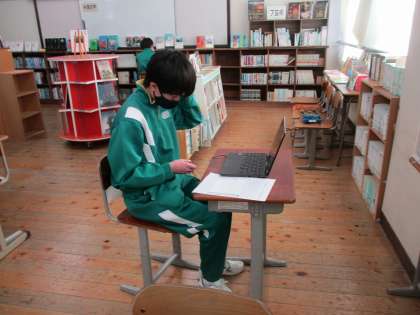 3年生が、言語英語の時間に、一人一人、オンラインでつながっているALTと会話をするという学習をしていました。