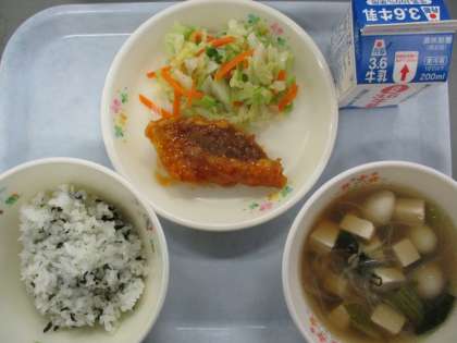 わかめご飯 牛乳 白身魚のチリソース 塩ナルム はるさめスープです。