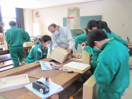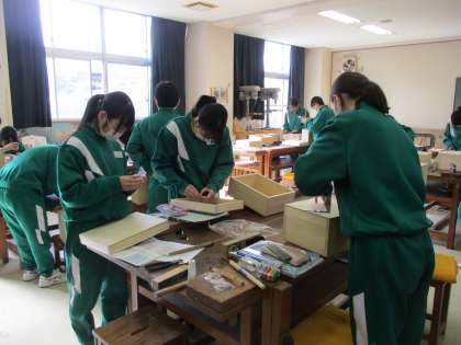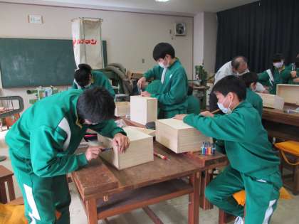 ちょうつがい(開き戸や開きぶたなどが開閉できるようにとりつける金具)を使ってふたと本体をつなげる作業をしている生徒が多かったかもしれません。