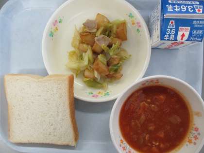 食パン 牛乳 ポークビーンズ ポテトと野菜のソテー です。