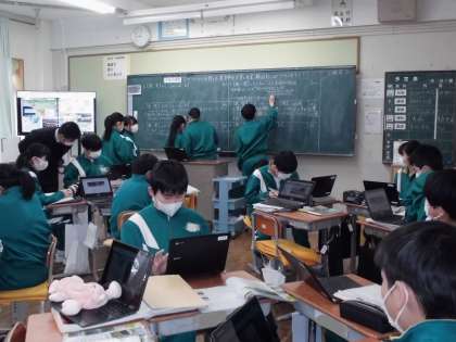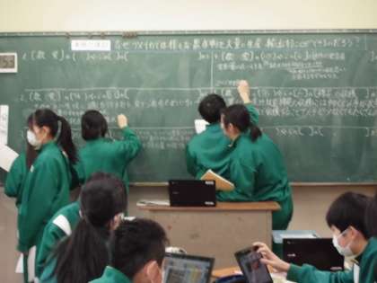 教科書、資料集(クロームブック)から読み取り、グループで黒板に記入、発表しています。