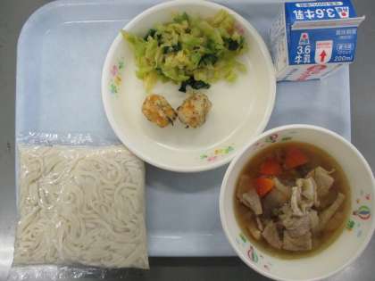 牛乳 肉うどん ちくわのお茶揚げ からし和え
