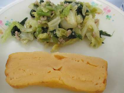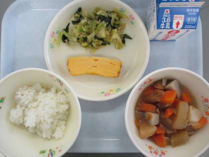 ご飯 牛乳 あつ焼き卵 ぶたにくと野菜の炒め物 おけんちゃんです。