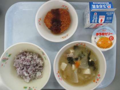 ゆかりご飯 牛乳 チキンカツ とんじるです。