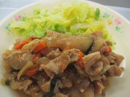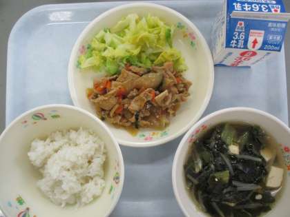 ご飯 牛乳 スタミナ焼き肉 ボイルドキャベツ わかめスープ です。