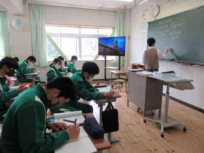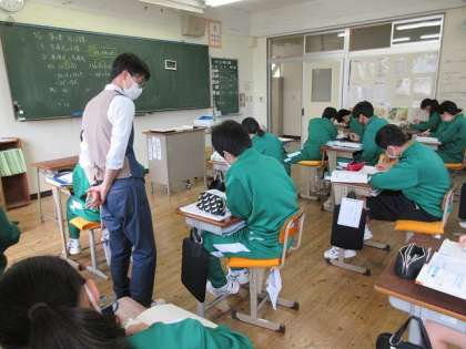 生徒たちは、3x(x+5)などの計算に取り組んでいました。