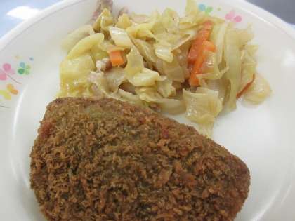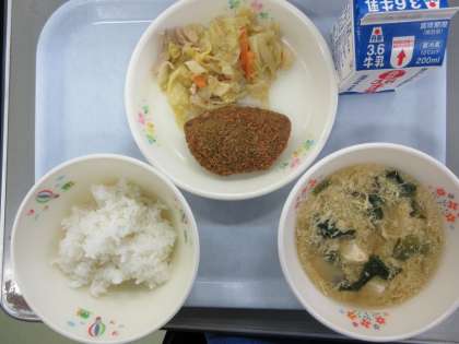 牛乳 黒はんぺん 豚肉と野菜の炒め物 かき玉汁 です。