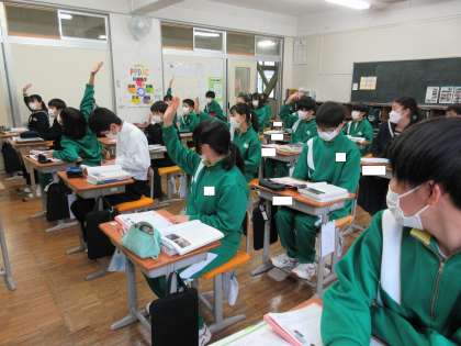 友達同士で話し合った後、たくさんの生徒が手を挙げて発表しようとうしました。