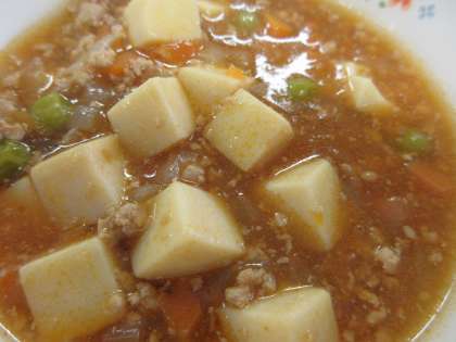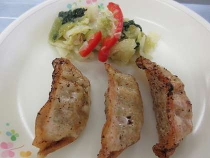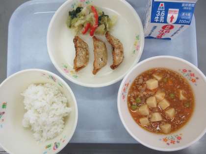 ご飯 牛乳 豆腐のチリソース煮 揚げ餃子 キャベツと青梗菜の炒め物です。