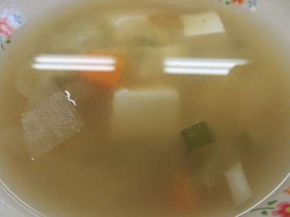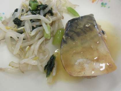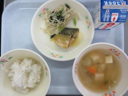 ご飯 牛乳 鯖の静岡みかん煮 もやし炒め スルガ汁(浜名湖産青のり入り、鱈のすり身ボール)です。