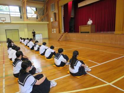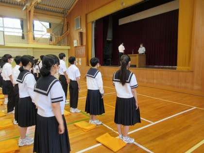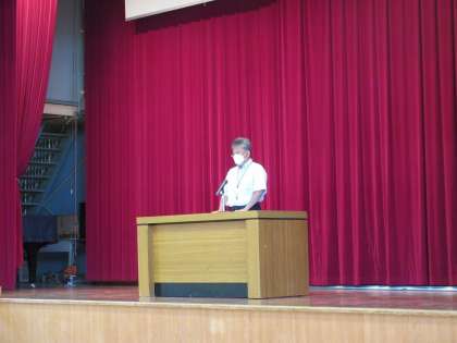 校長先生から中体連大会に関するお話、「素直で 賢く たくましく」という学校教育目標に関する話、コミュニケーション能力の大切さに関するお話などがありました。