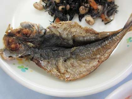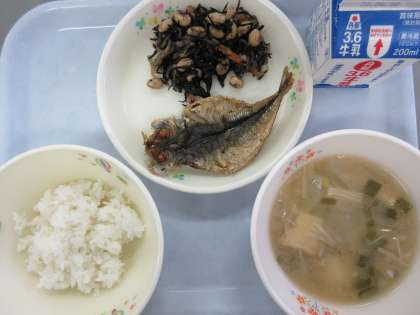ご飯 牛乳 アジの干物の素揚げ ひじきと大豆の炒め煮 じゃがいもの味噌汁
