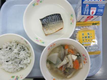 わかめごはん 牛乳 焼き塩鯖 鶏肉とごぼうの味噌汁 豆乳野菜マフィン
