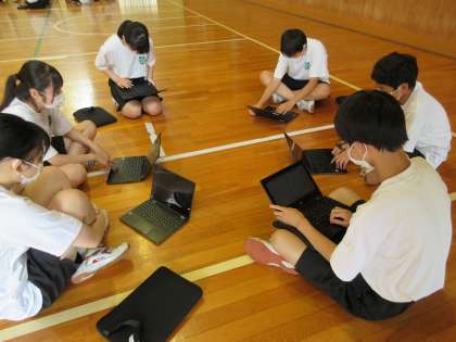 クロームブックを使って、チームの作戦を考えあっていました。