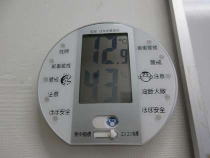 気温12.9度、湿度43%でした(保健室前の室温と湿度です)。 ついに気温が12度台です。