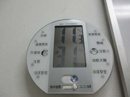 気温11.3度、湿度31%でした(保健室前の室温と湿度です)。