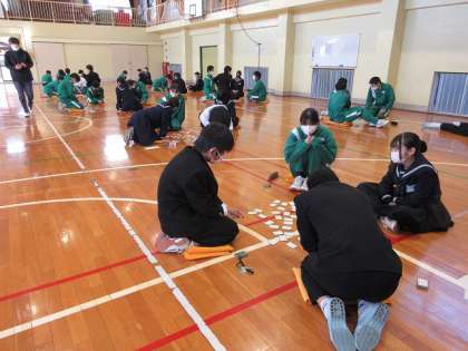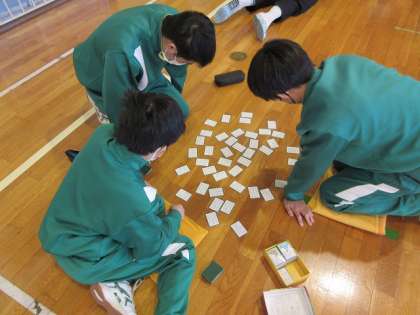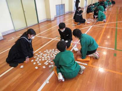 始業式、学級活動の後、生徒会企画の百人一首大会が、体育館にて開催されました。毎年恒例の行事で、浮島中の新年の風物詩です。ここまでの授業の中で練習を重ね、当日を迎えています。学年の枠を超えた4〜3人グループに分かれて競いました。読み手は教員が順番に担当しました。