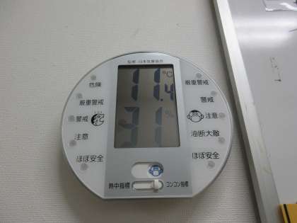 気温11.4度、湿度31%でした(保健室前の室温と湿度です)。