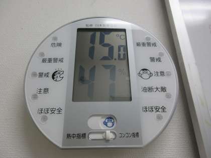 気温15.0度、湿度47%でした(保健室前の室温と湿度です)。