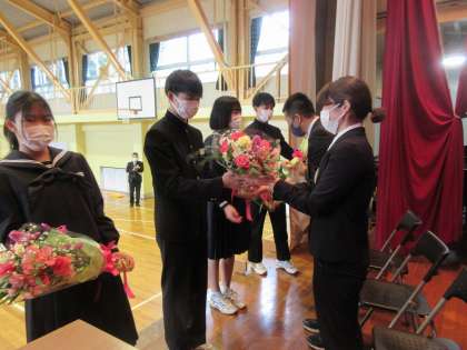 花束を渡しています。
