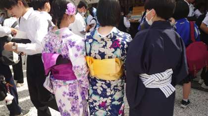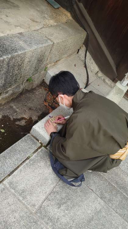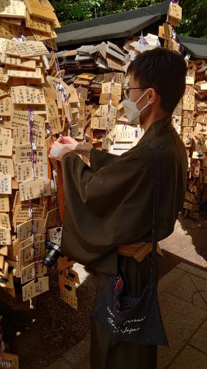 先生が、厳しい態勢で絵馬に願いを込めています。